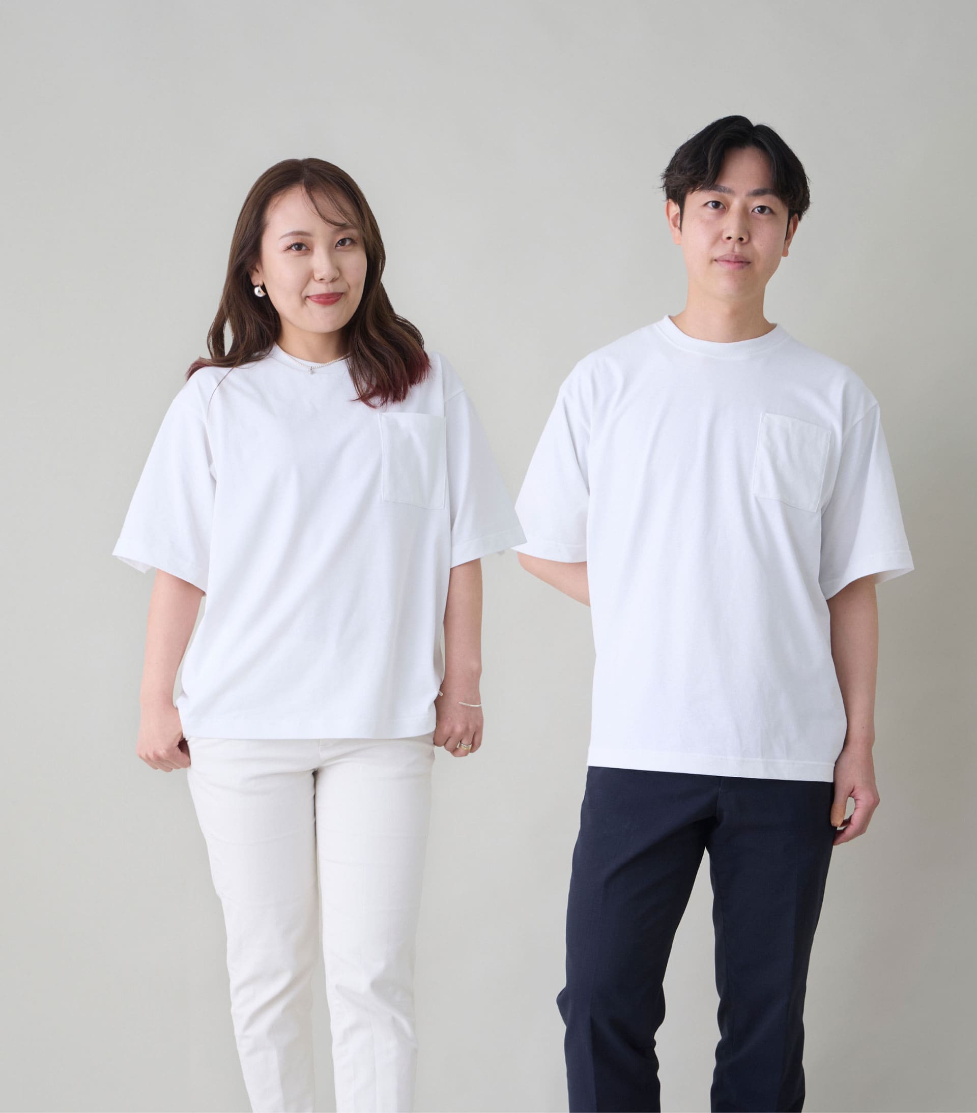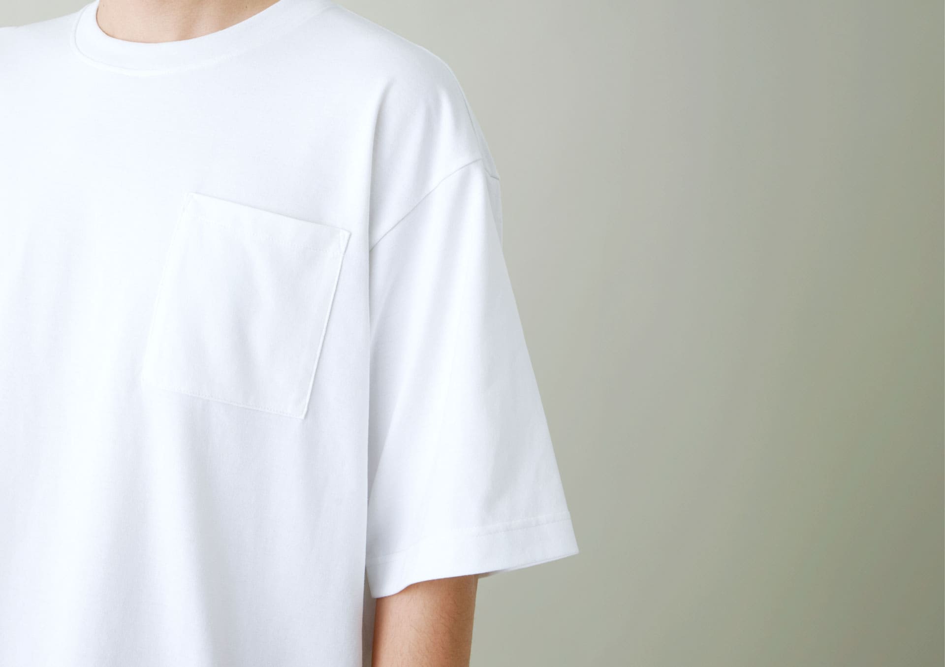首回りがヨレにくく、フォーマルなシーンでも活躍! 肩の落ち感とお腹周りにすこしゆとりをもたせることで、堅苦し過ぎず、緩すぎない絶妙なシルエットに仕上げました。